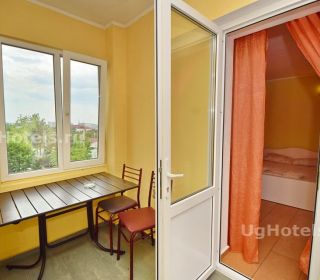 В номере: двуспальная или 2 односпальные кровати, шкаф, зеркало с тумбой, прикроватные тумбочки, телевизор, холодильник, сплит-система или кондиционер, санузел с душем. Все номера имеют выход на общий балкон, где для каждого номера стоит столик со стульями. Дополнительное место – кресло-кровать.
